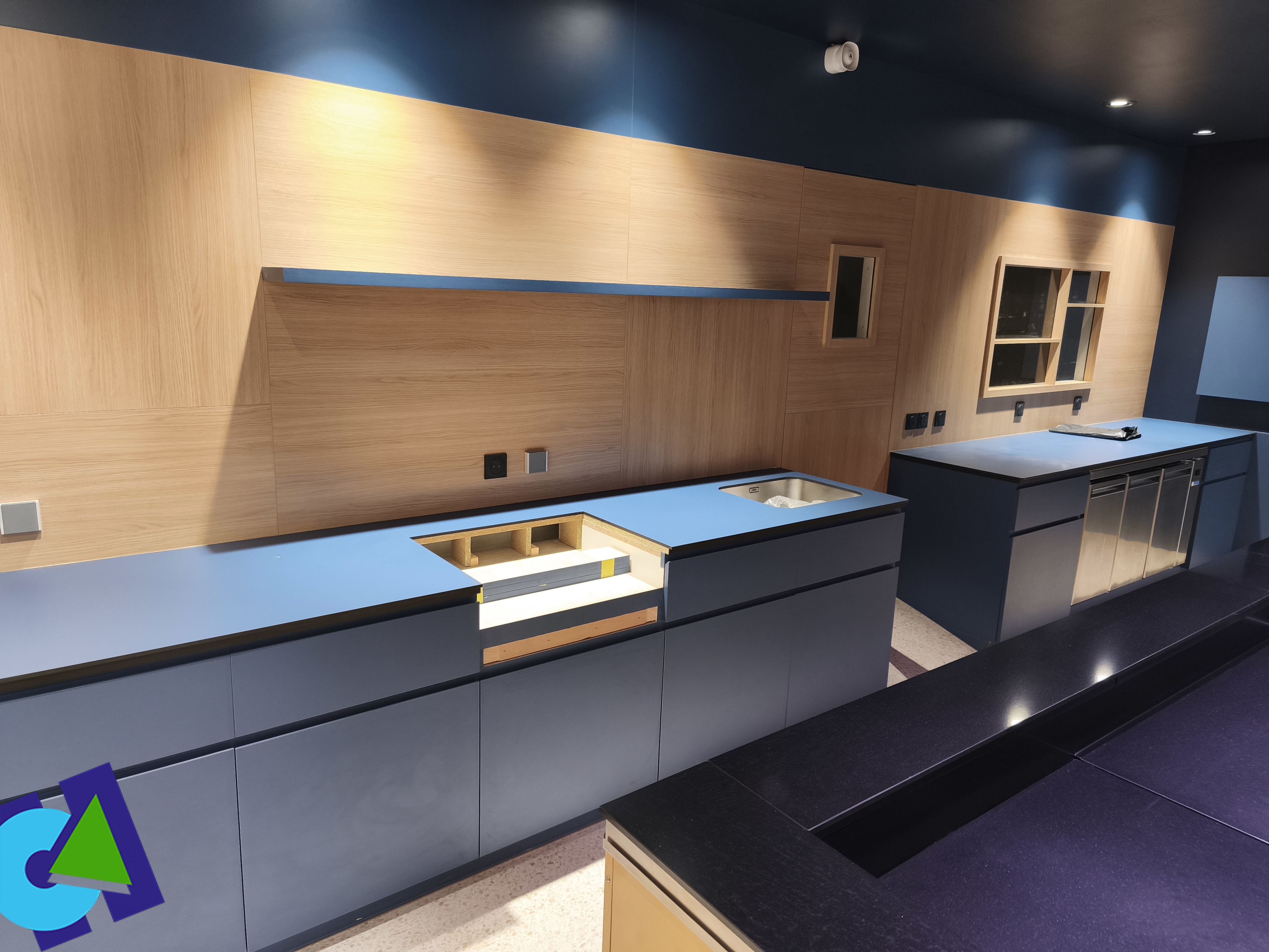 Fabrication et pose d'un meuble en vieux bois et mélaminé bleu- plateau en stratifié ton pierre