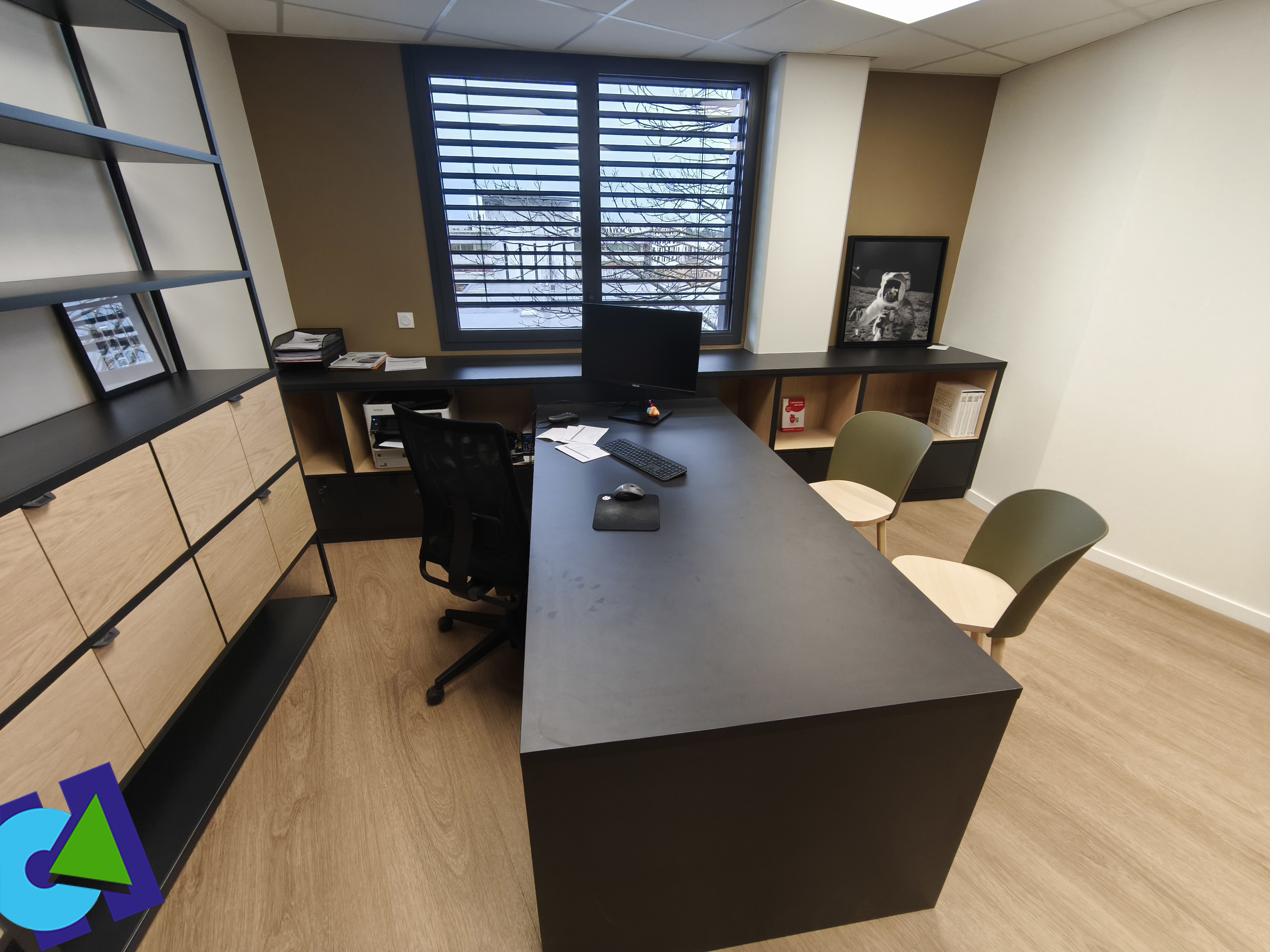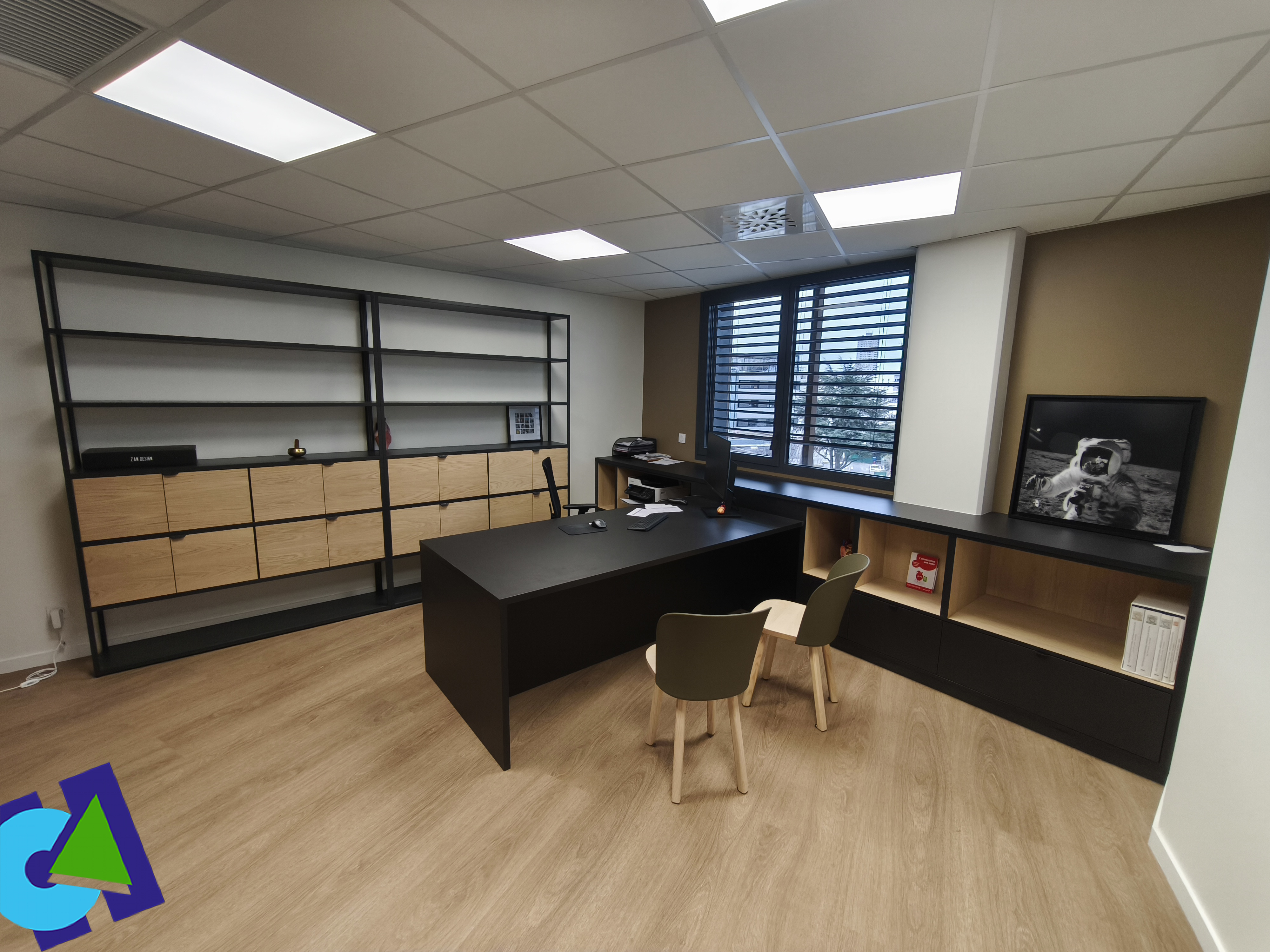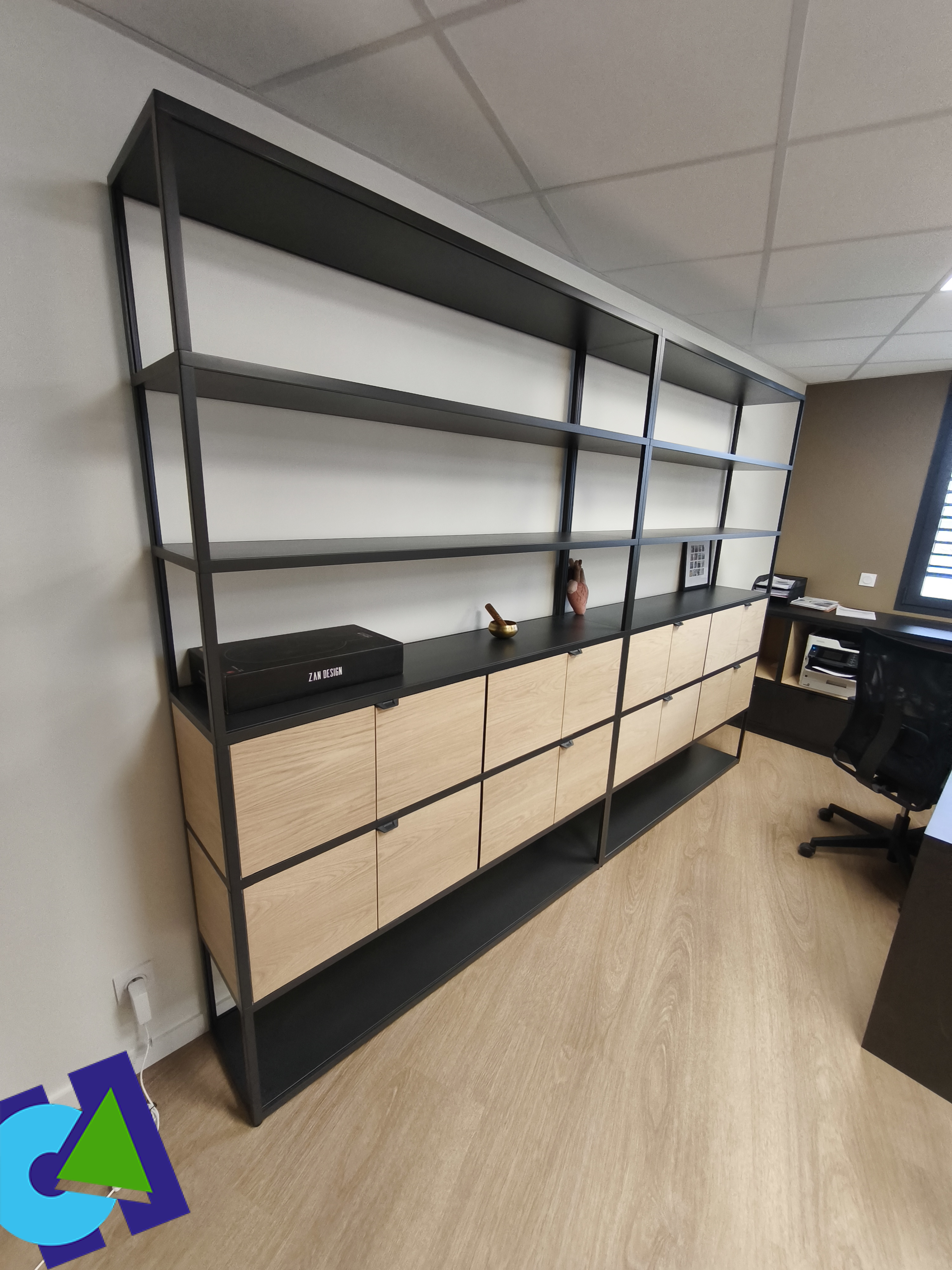 Fabrication et pose d'une bibliothèque et de bureaux.