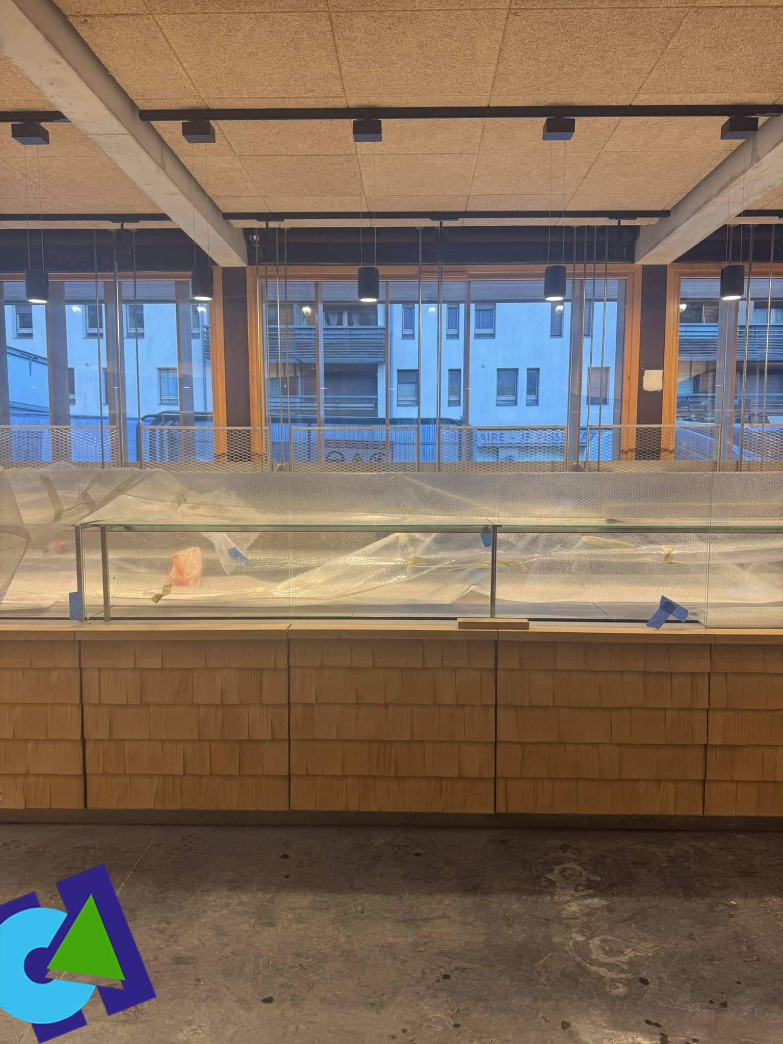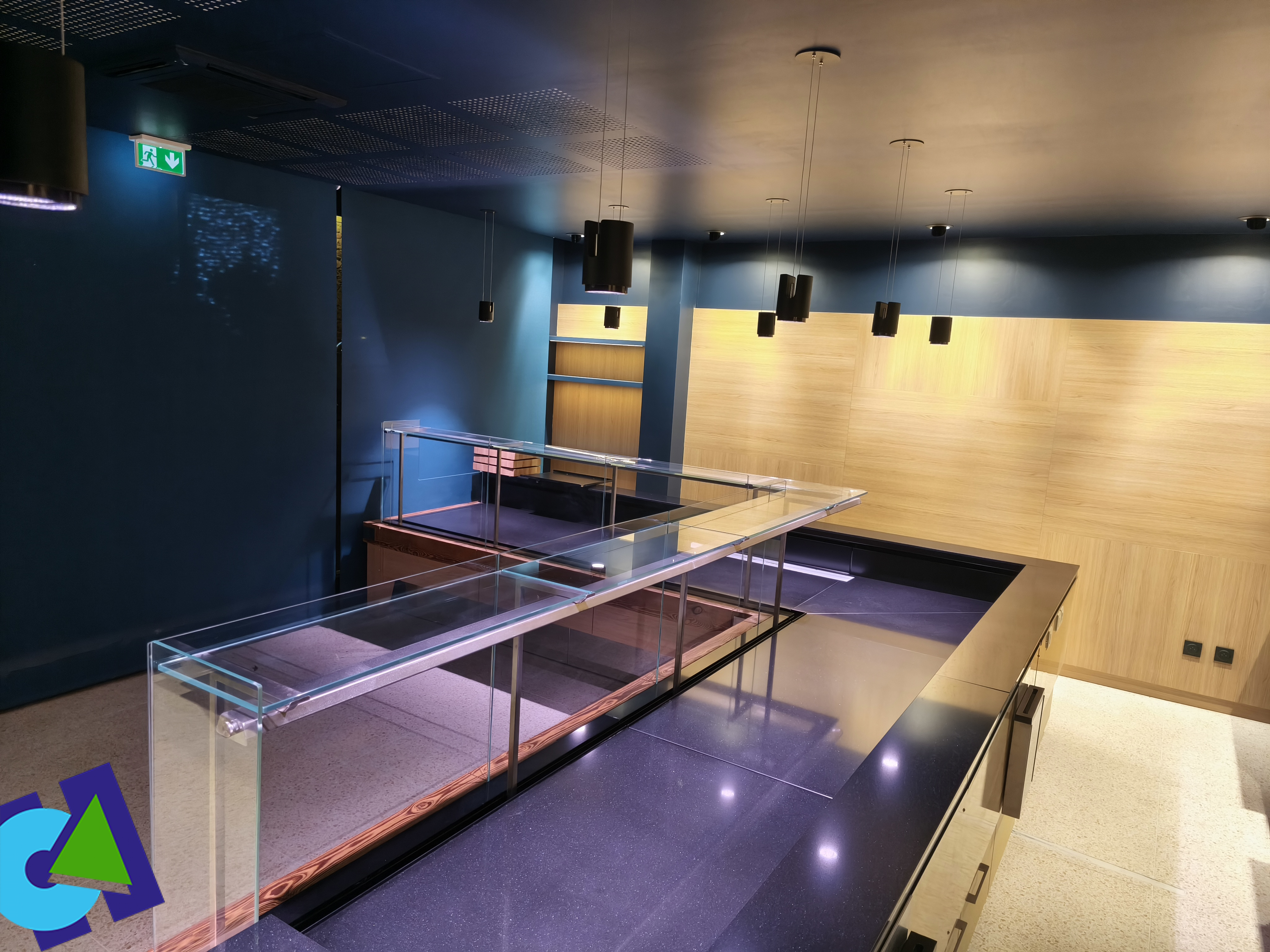 Habillage de vitrine - Habillage du poteau - Verrière de plafond et mobilier