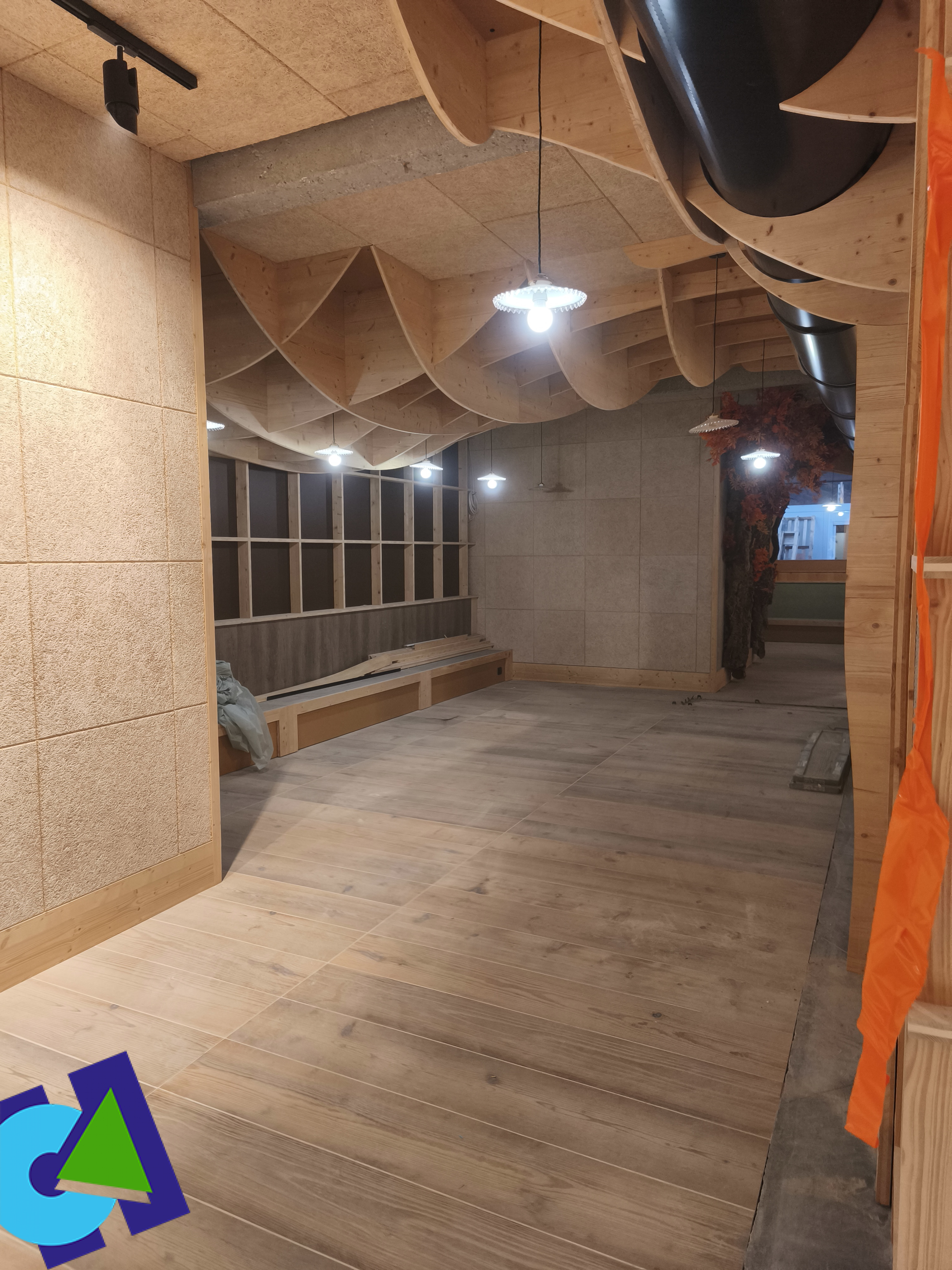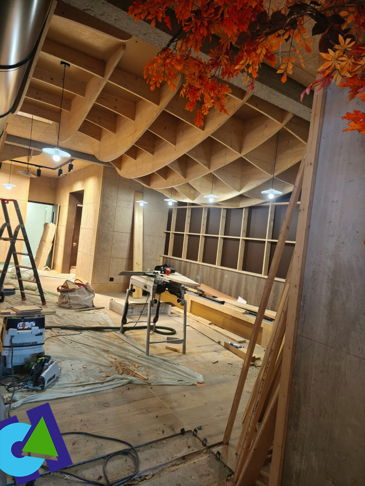 Fabrication et pose du plafond en bois ; des étagères et caissons