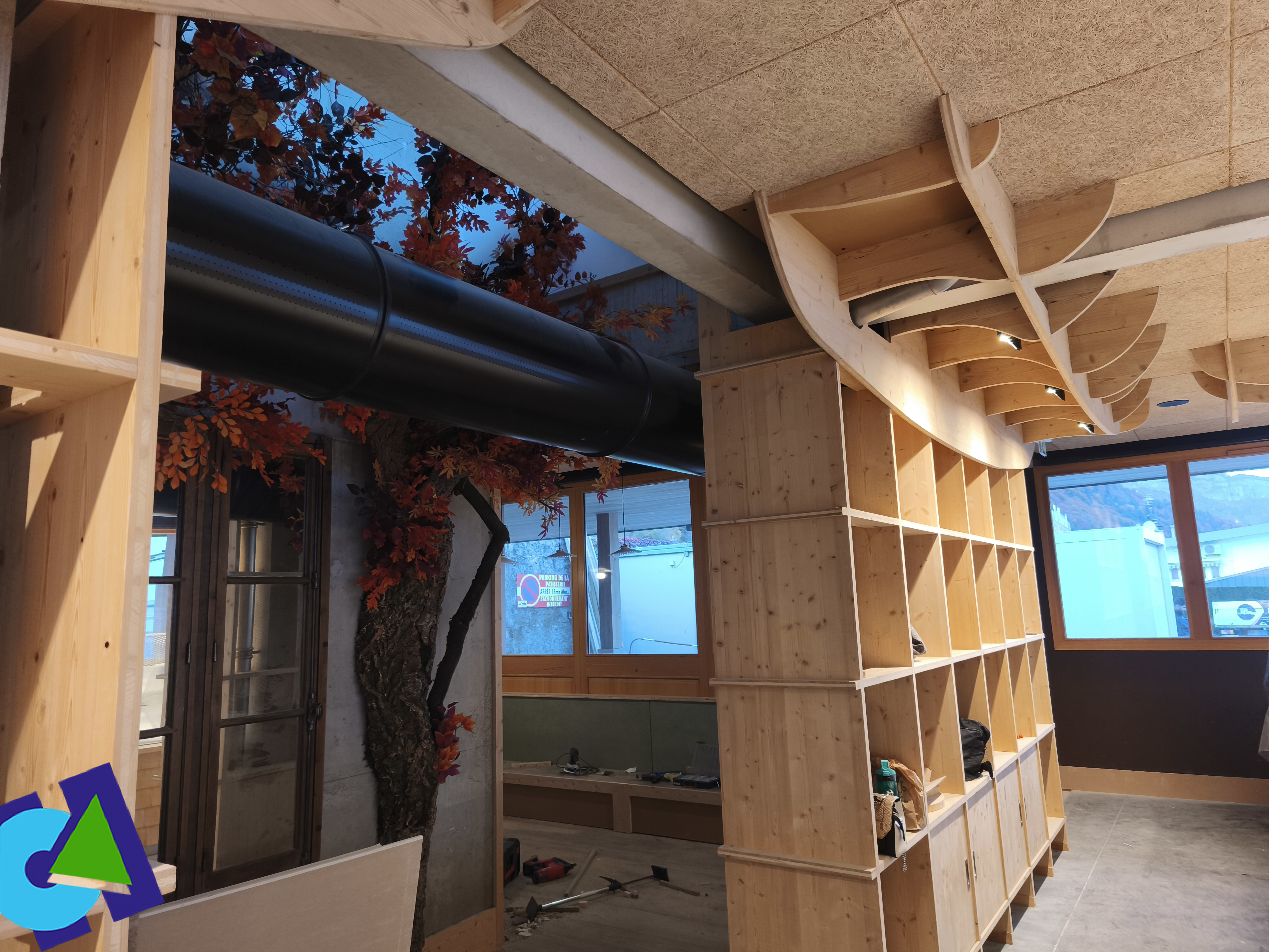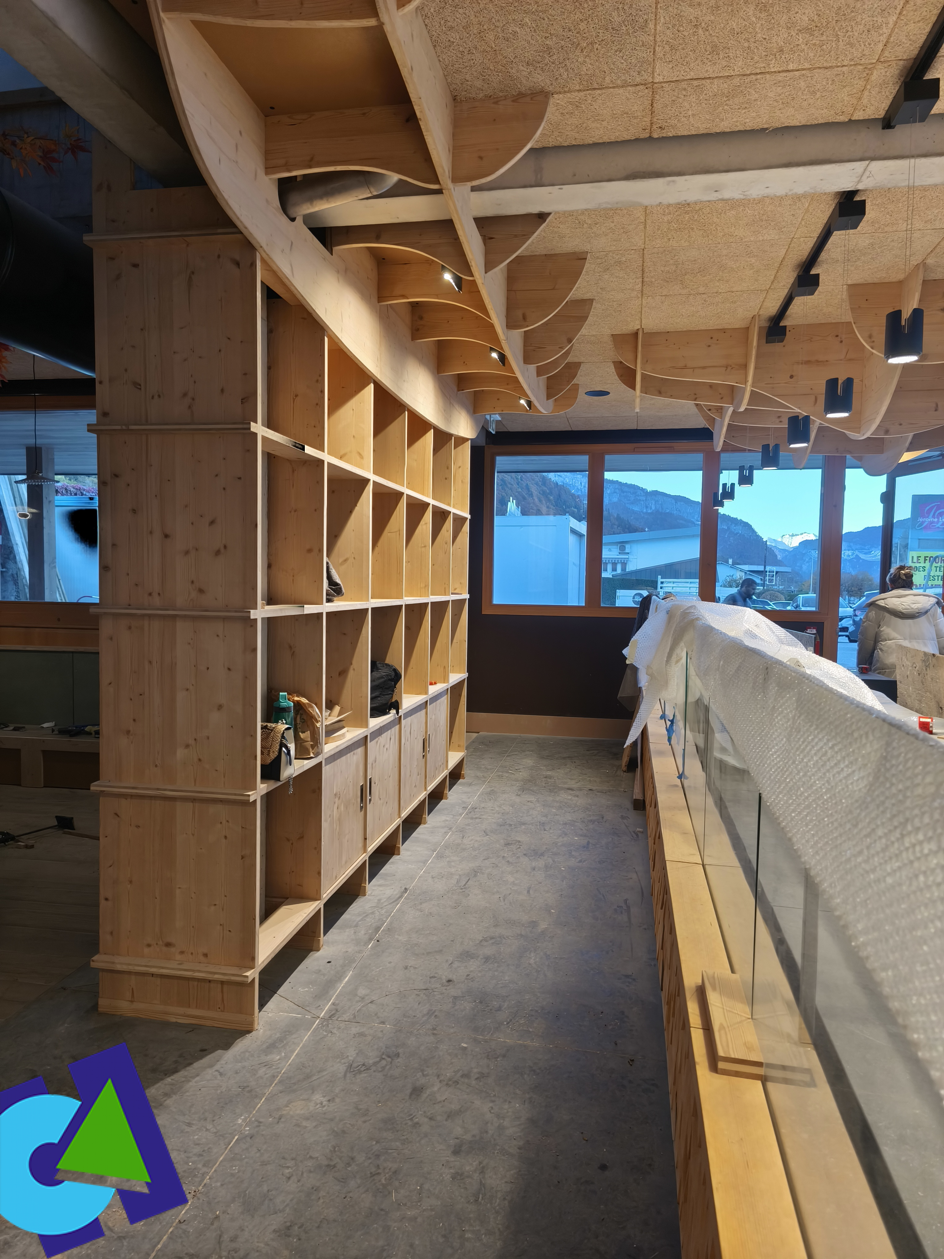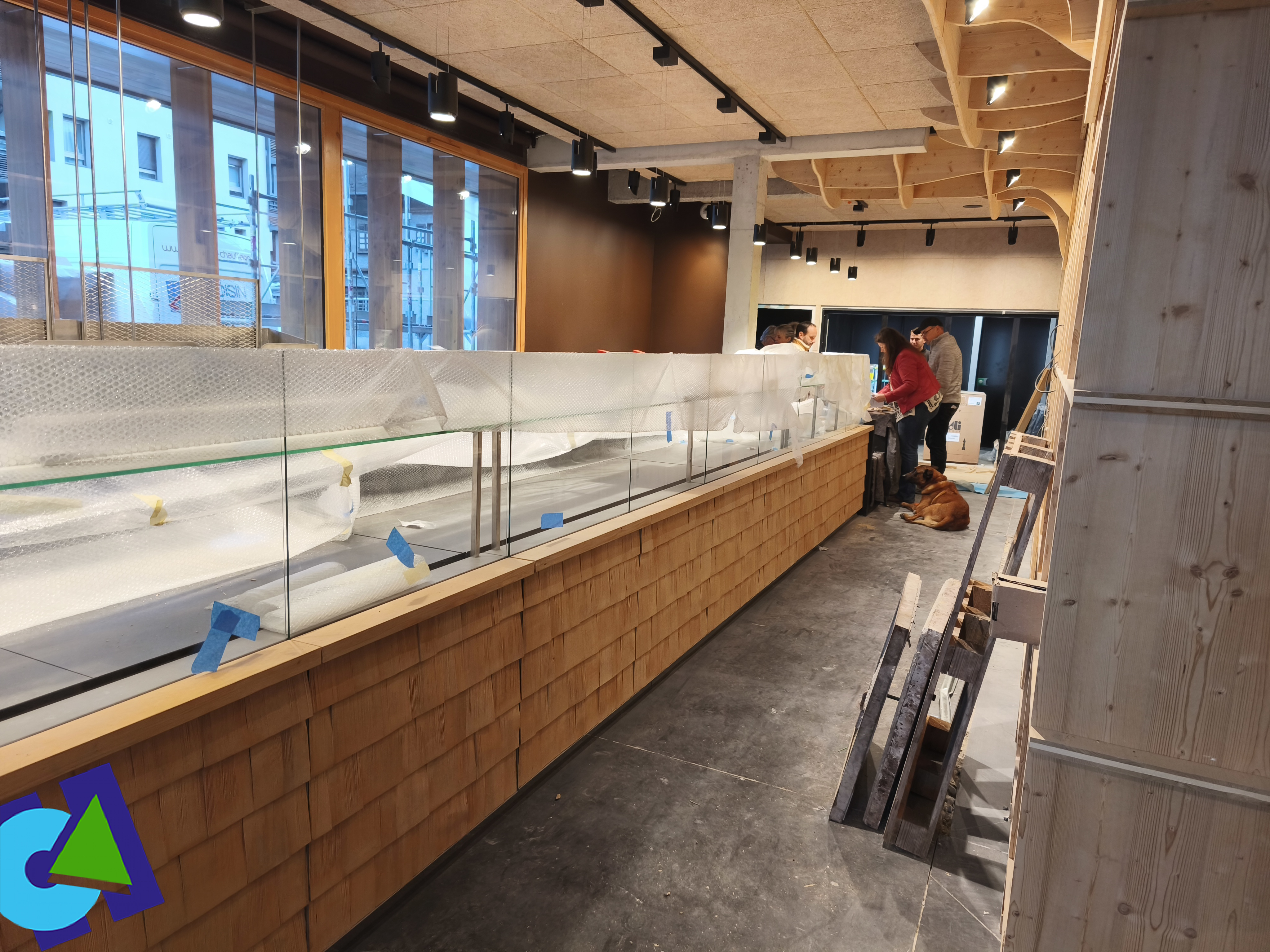 Fabrication et pose de meubles, de murs et réagencement de la banque.